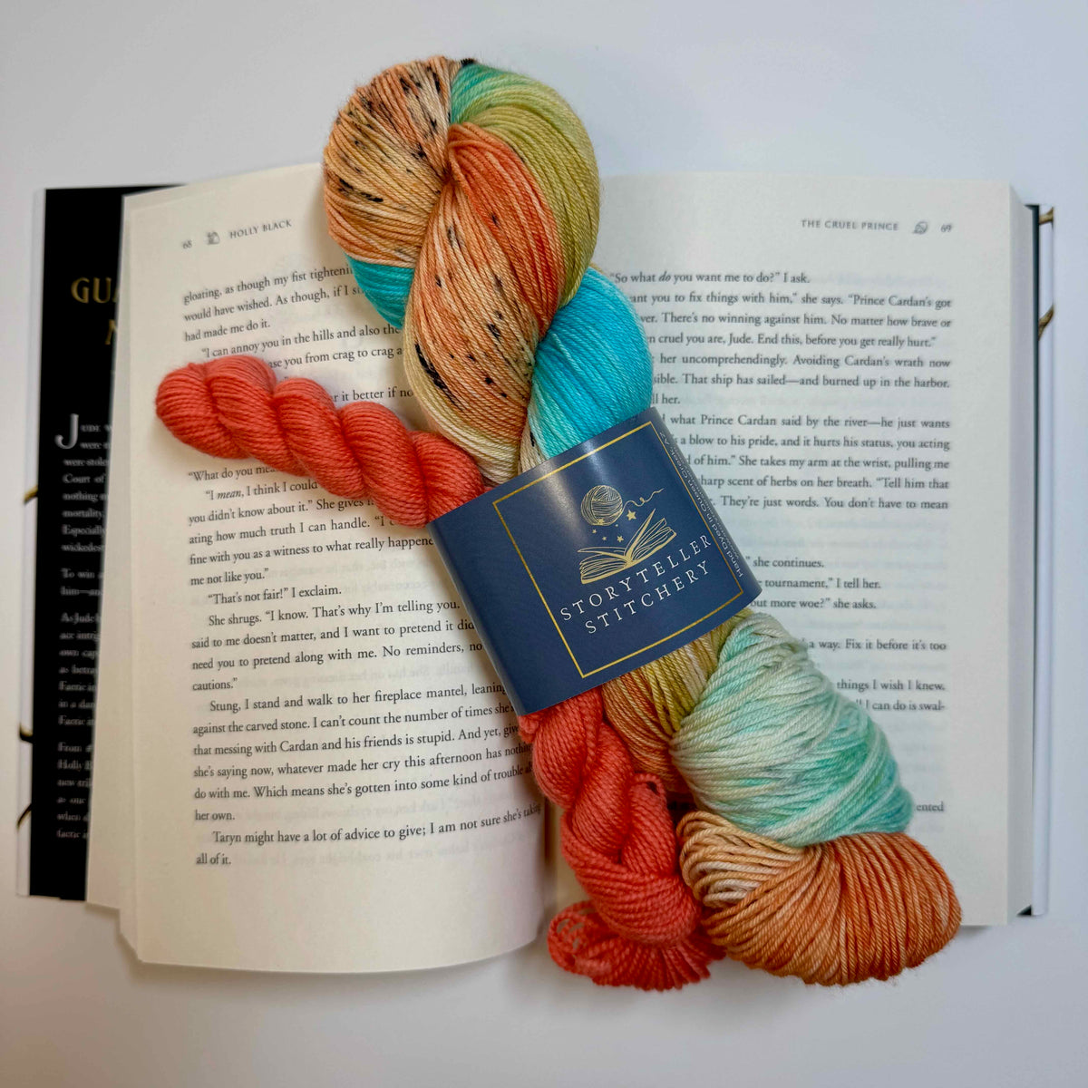 Step into the dazzling world of Faerie with Elfhame Enchantment, a colorway inspired by The Cruel Prince by Holly Black. Bright, magical jewel tones of teal, coral, and gold are accented with speckled depth to reflect the beauty, intrigue, and danger of Elfhame.