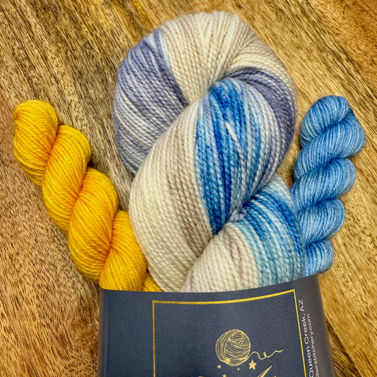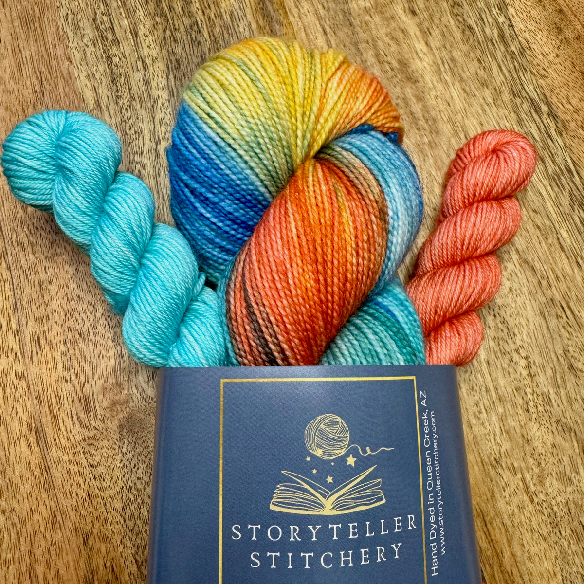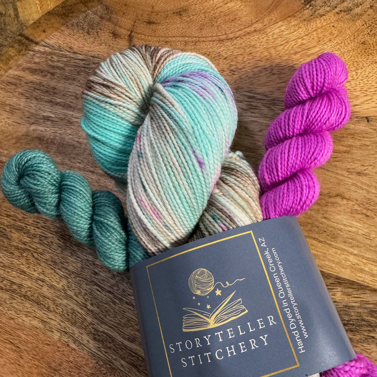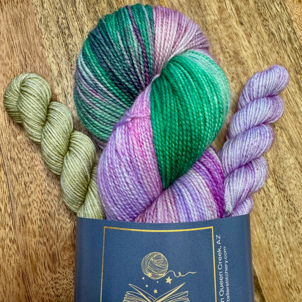 Sock Sets are little color stories waiting to be stitched — a full 100g skein paired with one or two coordinating 20g mini skeins, hand-dyed for effortless contrast and beautiful colorwork. They’re perfect for sock knitting with ready-made heels, toes, and cuffs, but their magic goes far beyond socks.